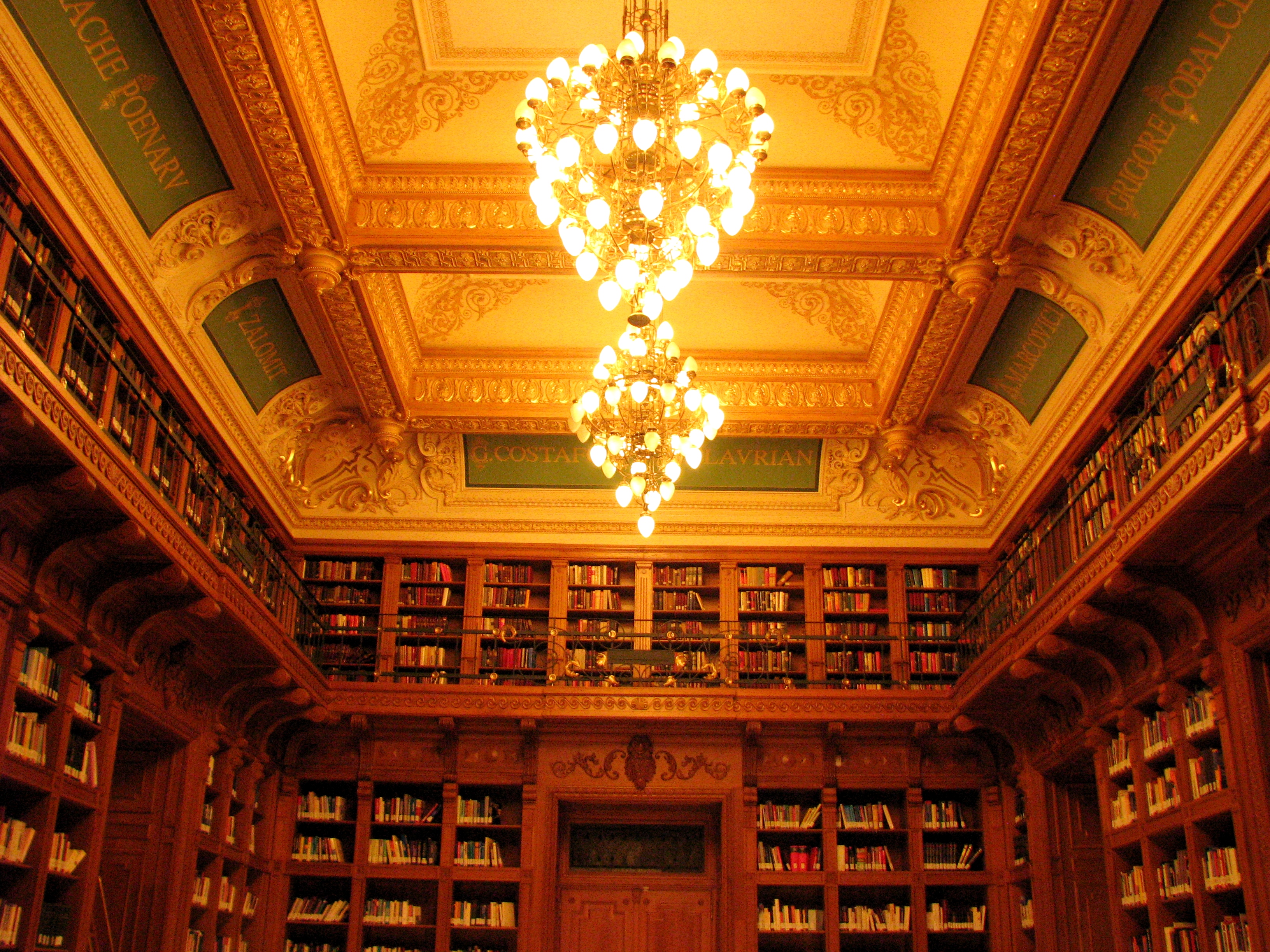 The stunning Teachers’ Room within the Carol I Royal Foundation Palace, opened to the public last night on the occasion of the Bucharest Museums Night. The Room was entirely destroyed during the events of the December 1989 revolution, when the roof and the upper floor of the building were engulfed by fire. By impressive solidarity, almost the entire lost book collection was rebuilt through worldwide donations.
