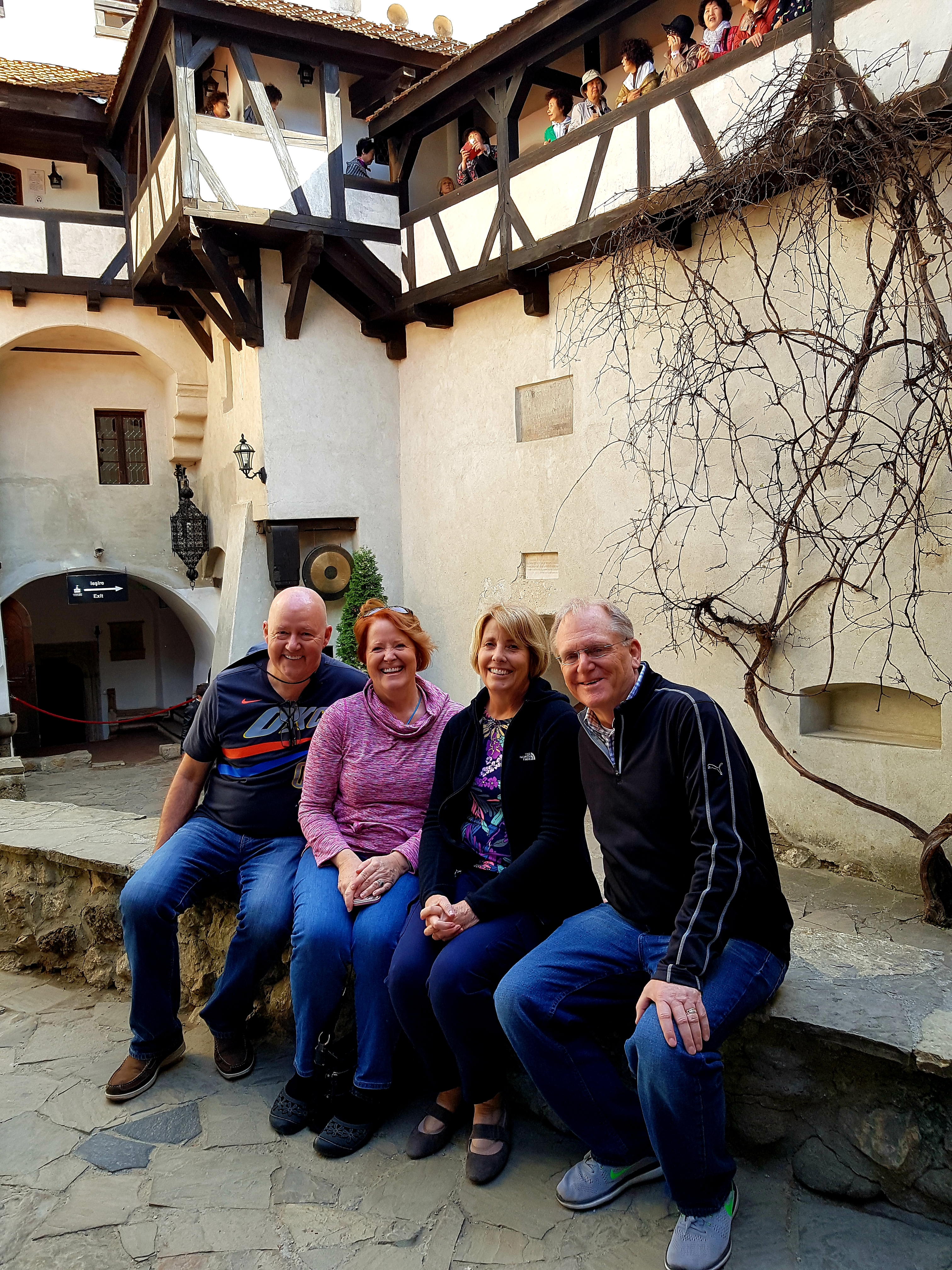 Cheerful tourists at Bran Castle, Transylvania, April 2018