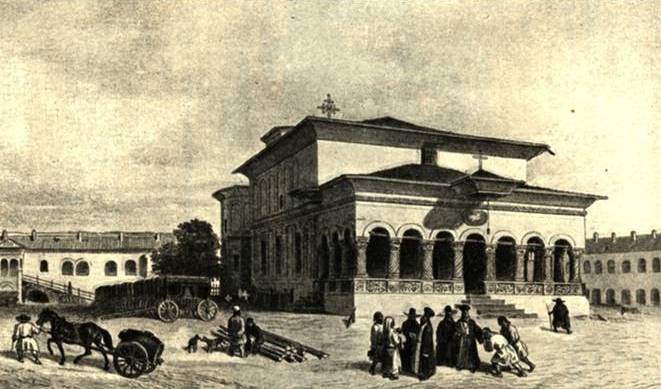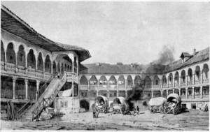 The New St George Church and its inn, destroyed in The Big Fire of 1847 (engraving from 1837). A widespread phenomenon of the time was that of churches located inside the inns’ courtyards. As the inns were highly profitable, they sustained the monasteries financially, while also providing protection through their thick walls and heavy gates.