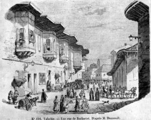 Street in Bucharest, 1841 (woodcut after Ch. Doussault) with civil architecture of Ottoman influence.