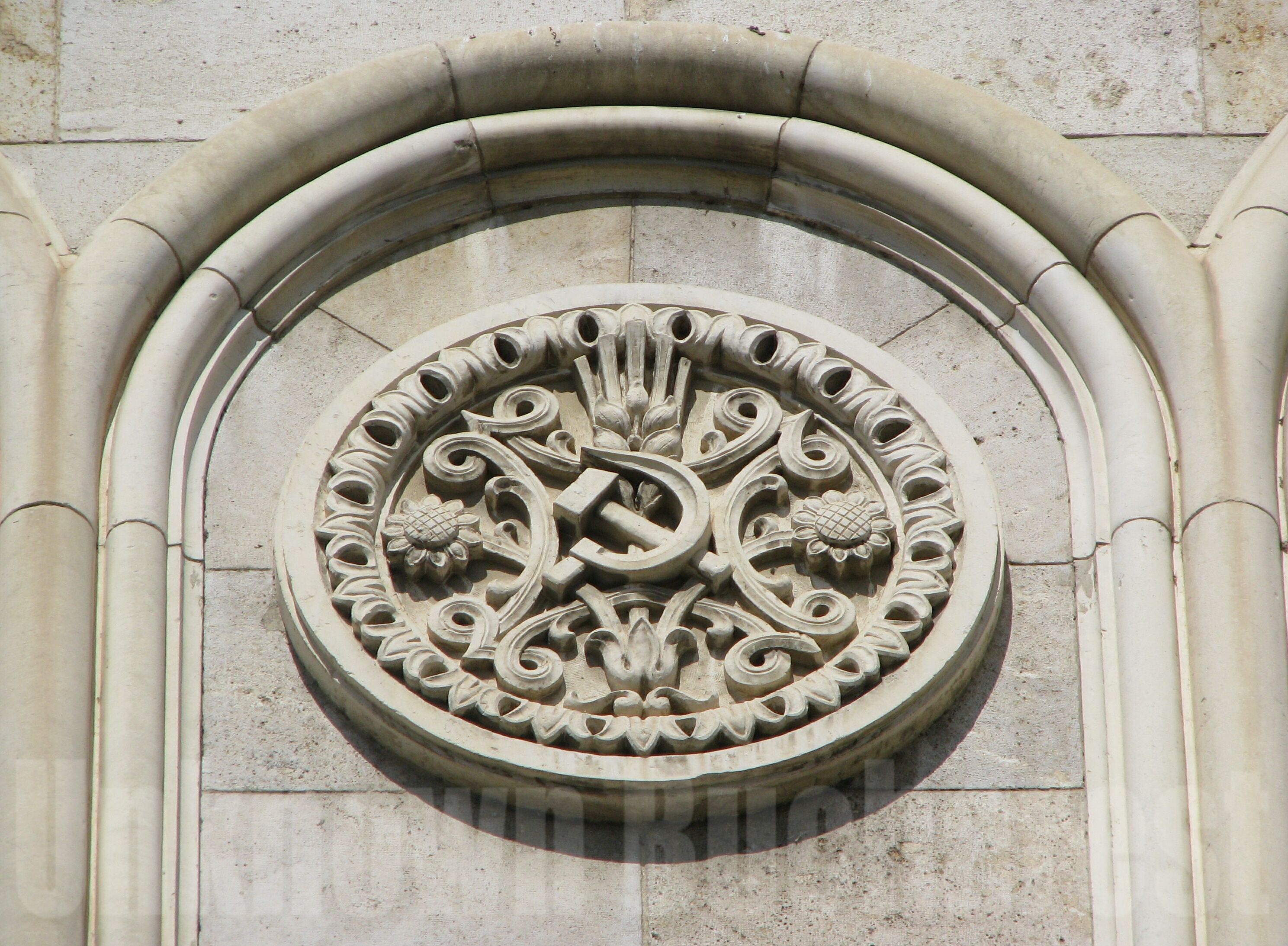 Casa Scanteii – “House of the Spark” (1957) » Decorative medallion with Communist Symbol “Hammer & Sickle” featured on Casa Scanteii (“House of the Spark”), Bucharest