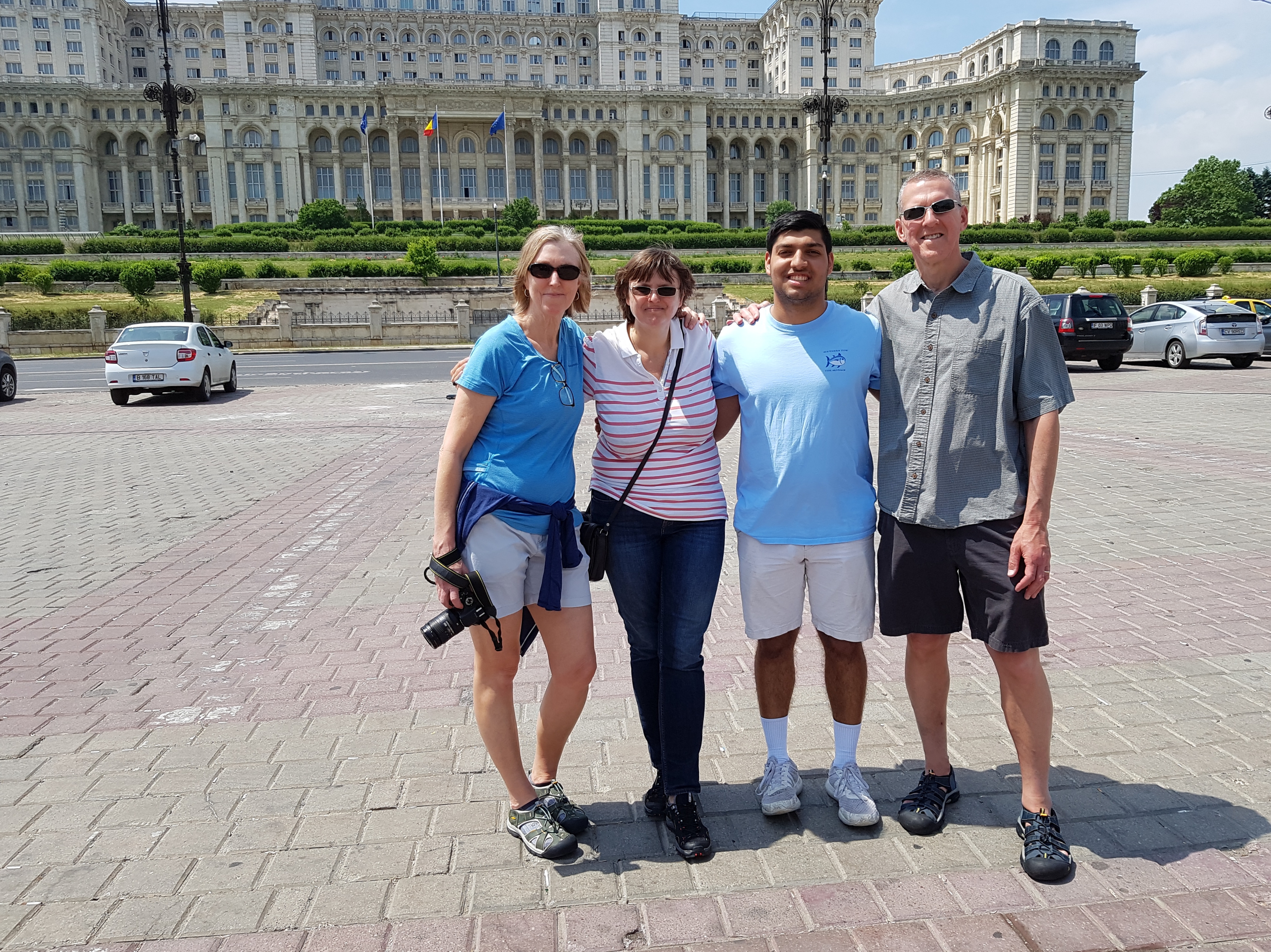 With new friends in front of the Palace of Parliament during Bucharest tour, June 2017
