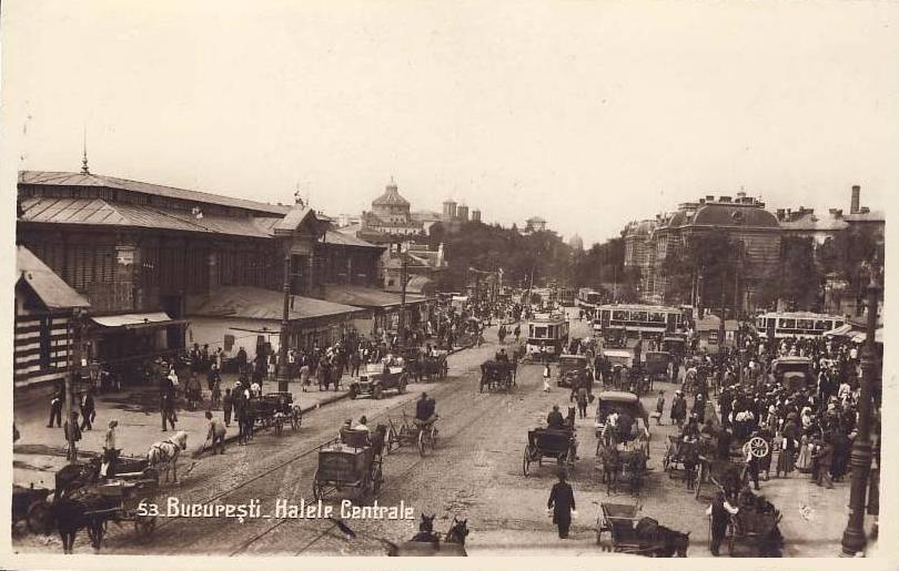 The Central Market House (Halele Centrale) on the site of the present day Piata Unirii. The Market House was dismantled in the 1930s, as part of a city modernization plan initiated by King Carol II. In the background to the left, one can recognize the dome of the Palace of Chamber of Deputies and the Patriarchy Cathedral complex.