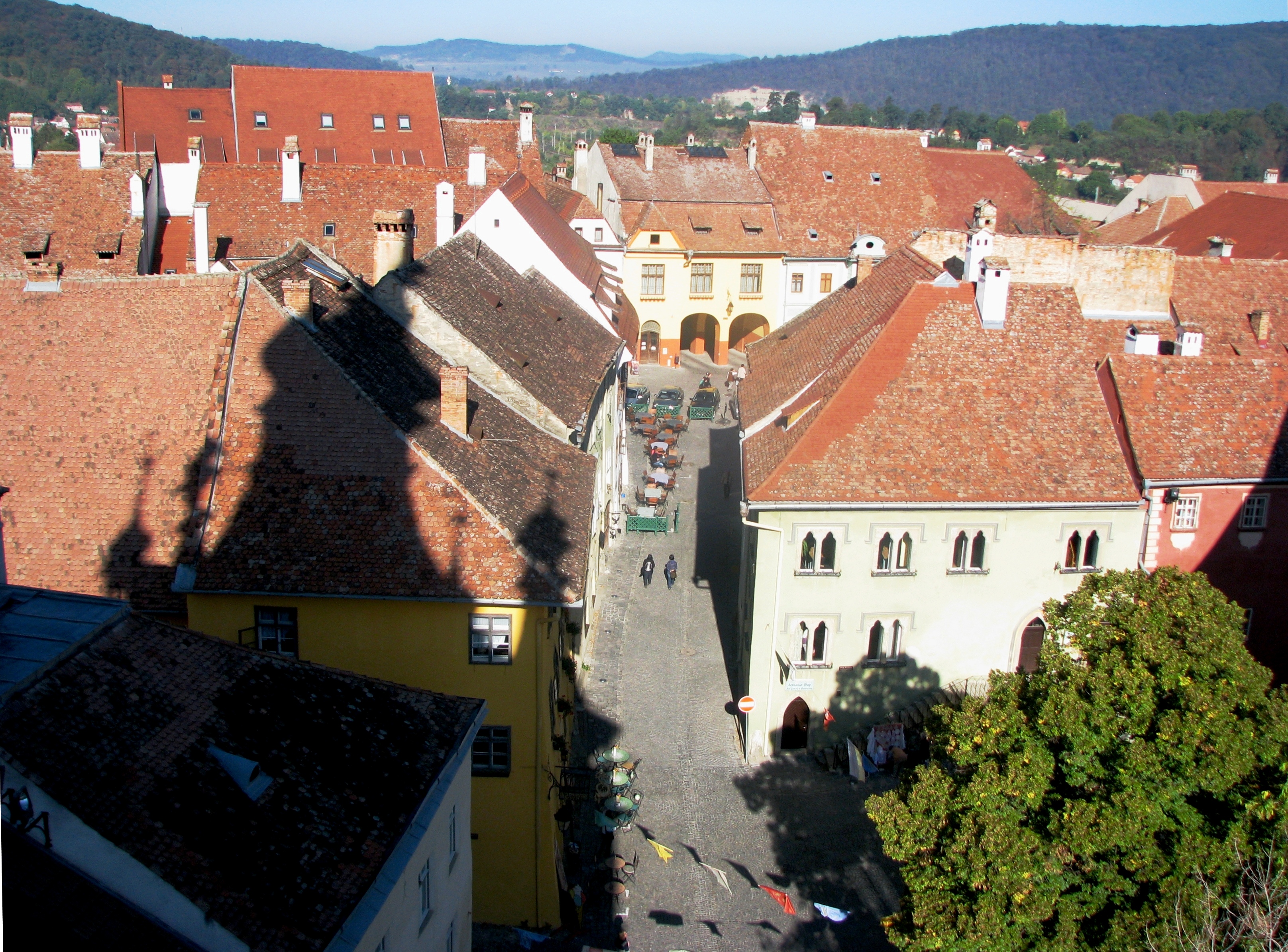 Top view from the Clock Tower to the medieval town of Sighisoara, Transylvania