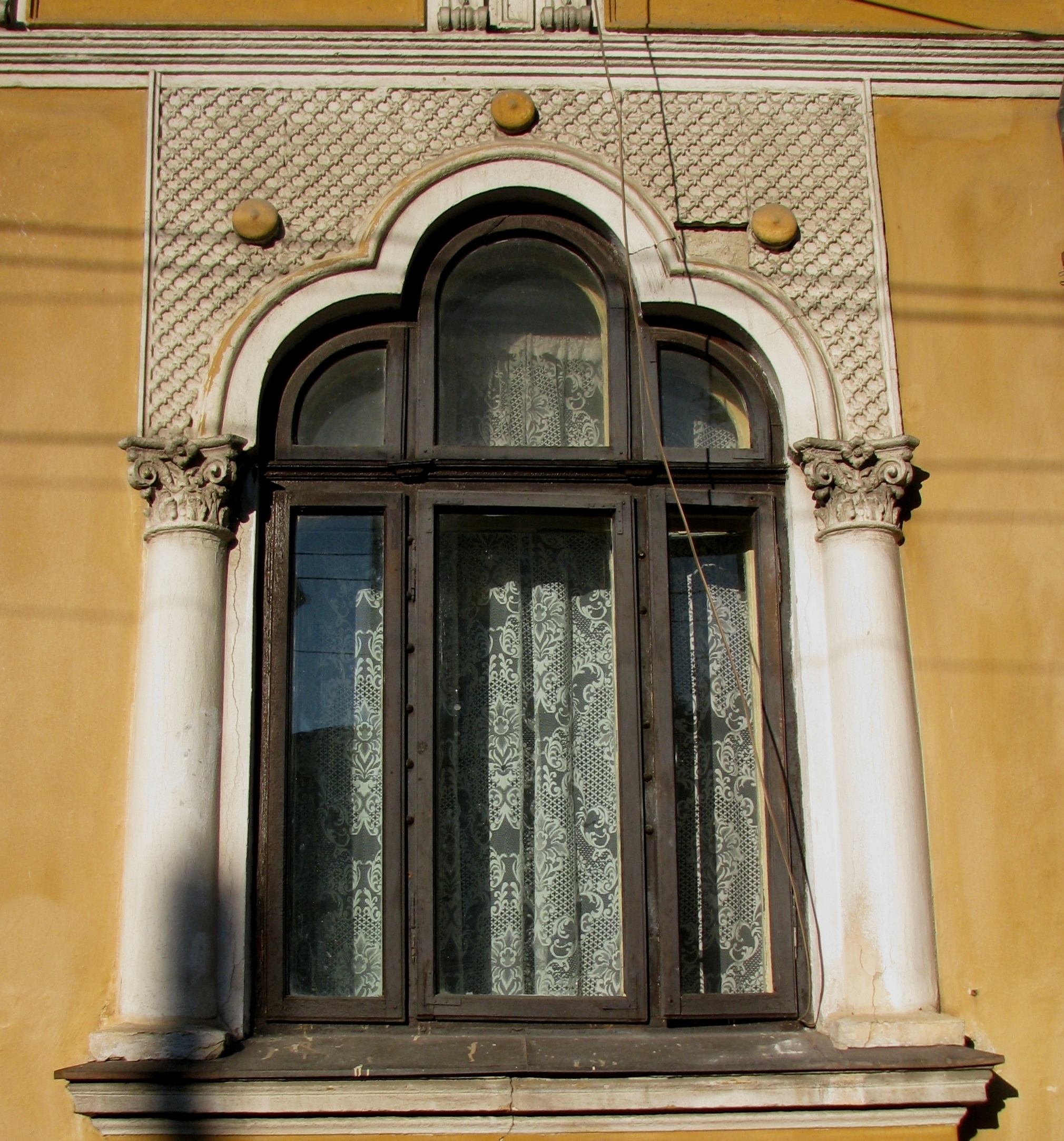Three-cusped arched Neo-Romanian style house window framed by columns with carved capitals, Bucharest
