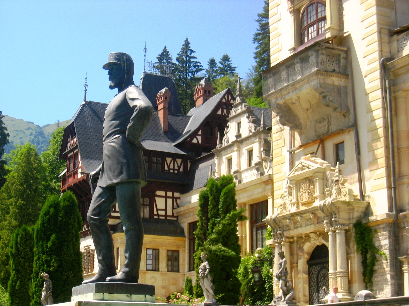 King Carol I Statue in front of his beautiful Peles Castle, Sinaia