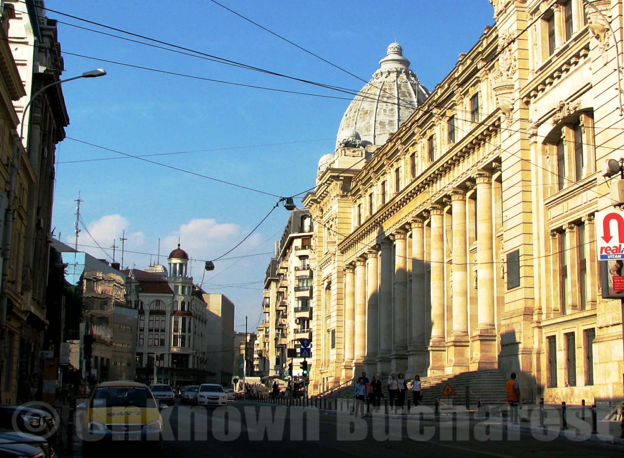 The beginning of the Calea Victoriei (the southern section) with the former Postal Palace on the right, enlightened by the sunset