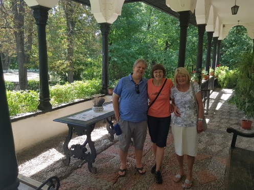 On the porch of beautiful Bellu Manor House during tour, Aug. 2022
